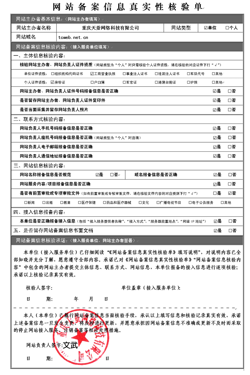 如,我們公司法人是文武,那么,網(wǎng)站備案的核驗(yàn)單填寫(xiě)范例如下: