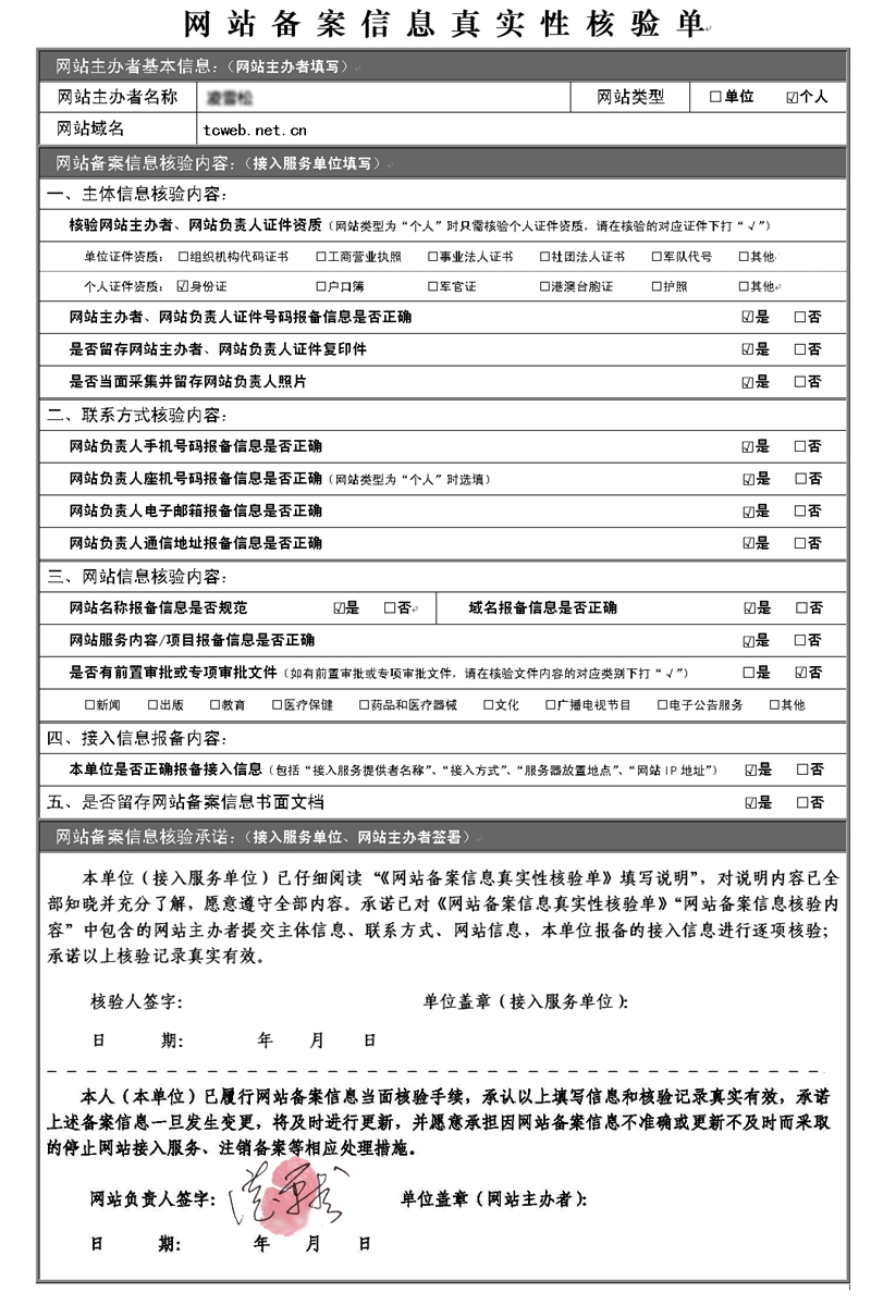 個(gè)人網(wǎng)站在天蠶重慶網(wǎng)絡(luò)公司建站后,個(gè)人備案填寫的核驗(yàn)單填寫方法如下范例: