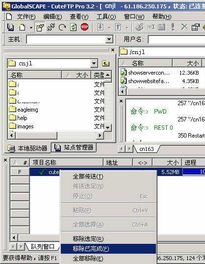 ★作好上述設(shè)置好,在"站點(diǎn)管理器"窗口中,雙擊剛才建立的上傳站點(diǎn),就可以登錄到服務(wù)器了。 ★成功登錄服務(wù)器后,窗口自動(dòng)跳轉(zhuǎn)到左邊的"本地驅(qū)動(dòng)器"子窗口中,選擇你要上傳的一個(gè)或多個(gè)本地文件,然后右擊選擇"上傳"就可以了。 ★你可以點(diǎn)擊最上面的"stop"圖標(biāo)停止上傳,如果要繼續(xù)上傳,右擊下面?zhèn)鬏旉?duì)列中的的文件,選擇"全部傳送"或者"傳送選定"即可。也可以選擇"移除選定"或者"全部移除"等菜單刪除傳輸隊(duì)列。如圖4。