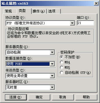 ★本公司一些服務(wù)器因?yàn)榘踩O(shè)置的關(guān)系,必須使用"port"方式登錄才能正常上傳文件,這時(shí),需要您在上面窗口中點(diǎn)擊"類型"選項(xiàng)卡(如圖3),在"數(shù)據(jù)連接類型"下拉框中選擇"使用 PORT",再點(diǎn)擊"確定"就行了。