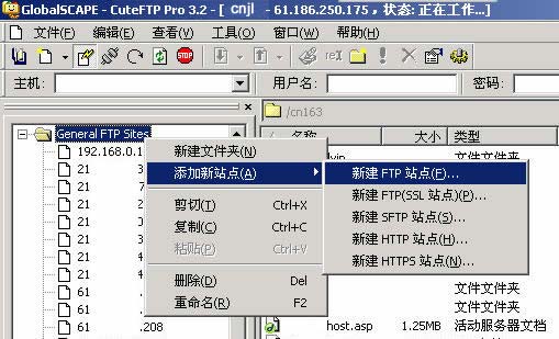 ★使用中國杰聯(lián)網(wǎng)空間,由于服務(wù)器的安全設(shè)置,請(qǐng)最好使用Cuteftp Pro進(jìn)行上傳,以避免使用其它軟件可能造成的麻煩! ★Cuteftp Pro下載地址: ★請(qǐng)點(diǎn)擊這里:下載Cuteftp Pro漢化注冊(cè)版 ★Cuteftp Pro安裝說明: ★下載上述壓縮包后,請(qǐng)使用winrar解壓到本地硬盤某個(gè)目錄下。 ★請(qǐng)查看里面的幫助文件,按照說明進(jìn)行安裝即可。 --==FTP上傳軟件使用==-- ★打開Cuteftp Pro,點(diǎn)擊左邊窗口"站點(diǎn)管理器",右擊"General FTP Sites"(如圖1),在出現(xiàn)的菜單中選擇"添加新站點(diǎn)"-->"新建FTP站點(diǎn)"。