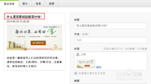 【1】上傳好合適的封面圖片后,填寫標題和正文內(nèi)容。