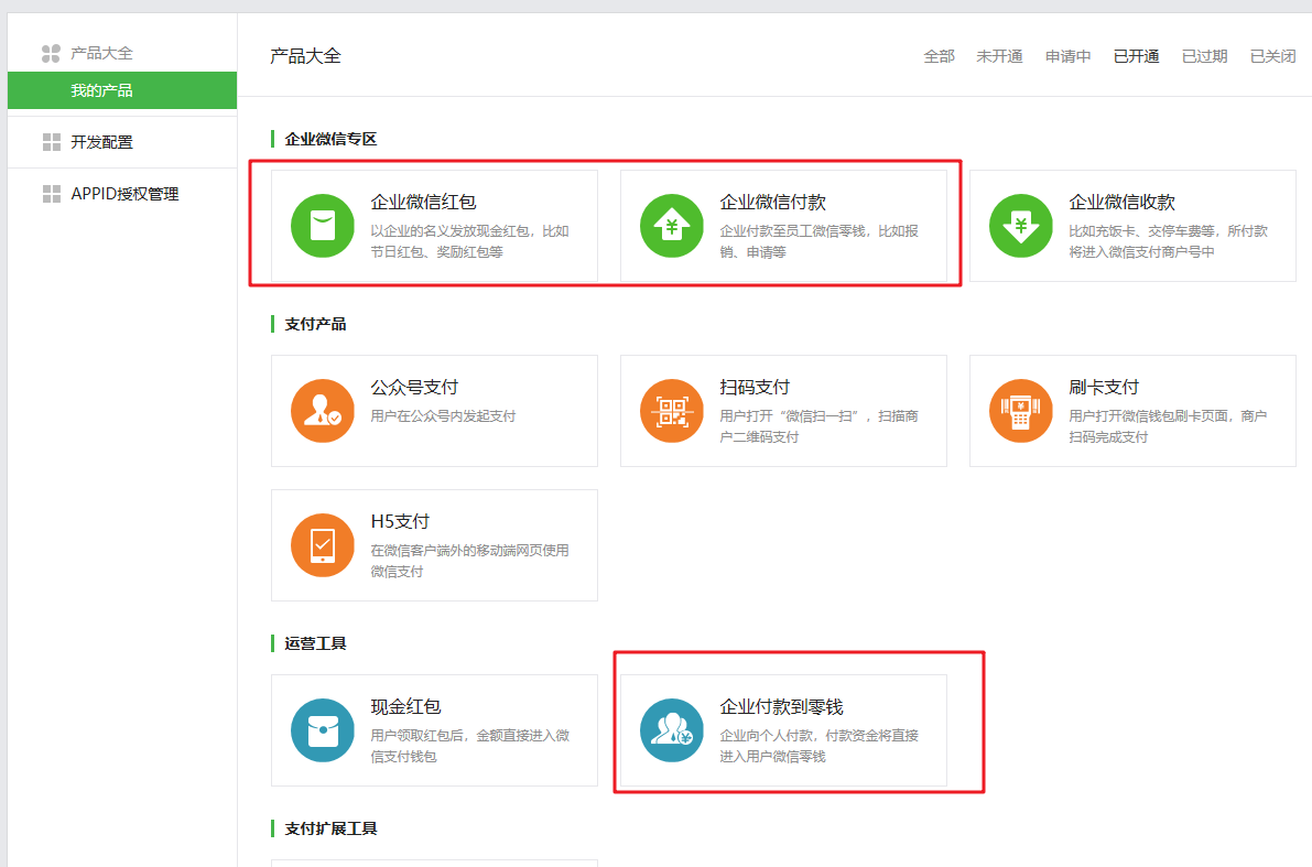 只需在微信支付商戶平臺,產(chǎn)品中心,開通【企業(yè)微信付款】與【企業(yè)付款到零錢】,如下圖所示: