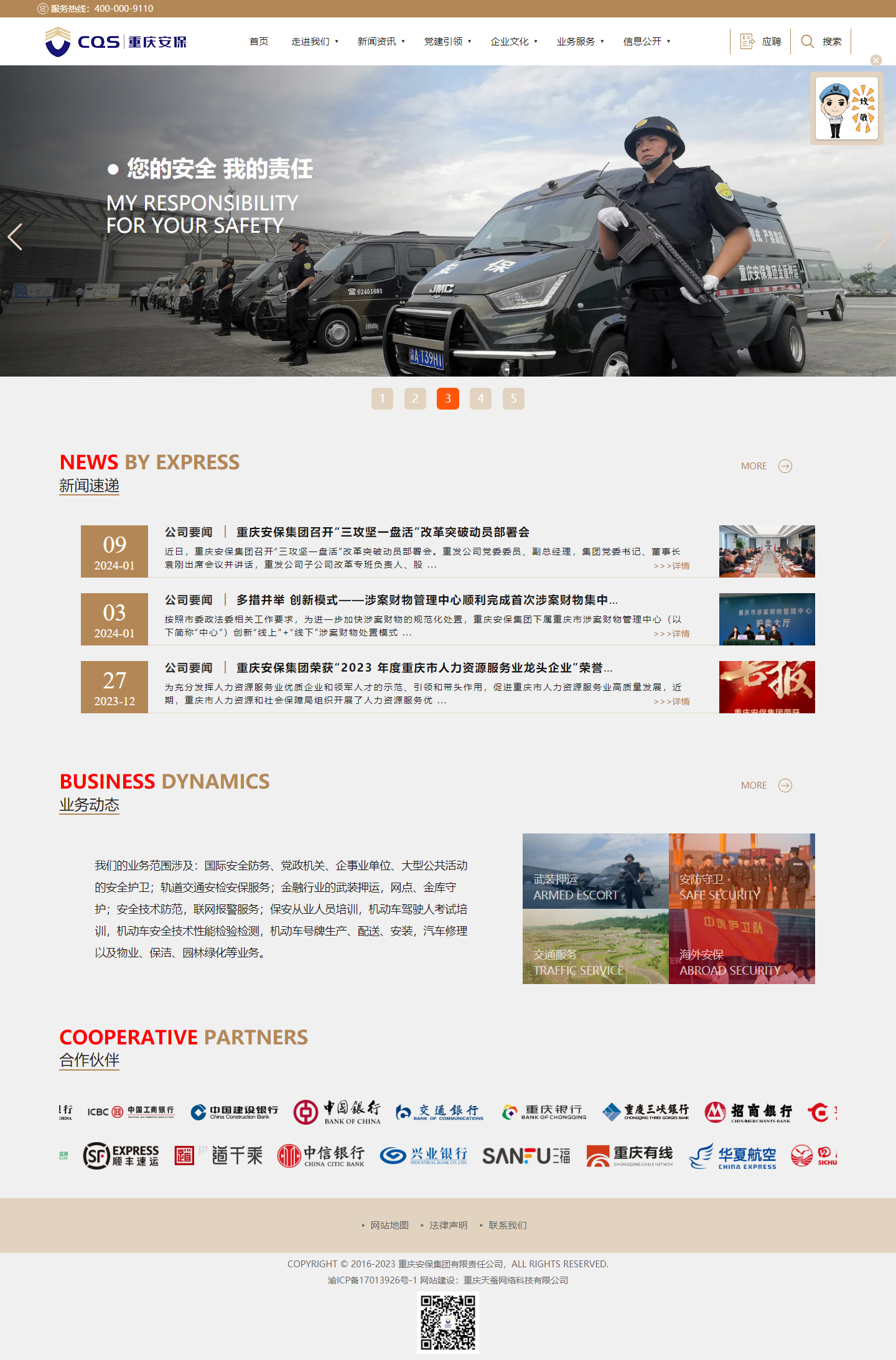 天蠶 重慶網(wǎng)絡(luò)公司小編語: 重慶安保公司成立于2011年8月,主要從事保安服務(wù)、勞務(wù)派遣、物業(yè)管理、安全技術(shù)防范系統(tǒng)設(shè)計(jì)施工、視頻監(jiān)控安裝及維保服務(wù);提供安防智能一體化解決方案。公司遵循“積極防衛(wèi)、安全第一、優(yōu)質(zhì)服務(wù)、信譽(yù)至上”的服務(wù)理念,致力于維護(hù)社會治安、維護(hù)公共安全、發(fā)揮重要輔警作用。