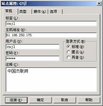 ★在出現(xiàn)的"站點(diǎn)屬性"窗口(如圖2)中,在"常規(guī)"選項(xiàng)卡中,輸入您的FTP相關(guān)資料,其中"登錄方式"中選擇"標(biāo)準(zhǔn)"。再點(diǎn)擊"確定"就行了。